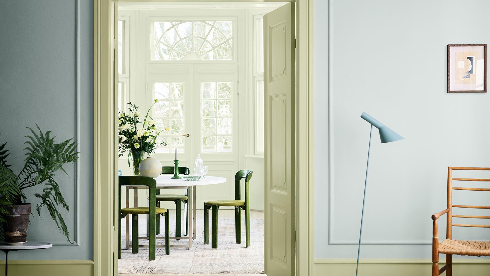 En nydelig blå palett med lyse, friske – og støvete, grønnaktige blåtoner. Fargene vil gi hjemmet ditt en deilig, sval følelse. De grønnaktige undertonene vil gi fargene en gyllen ro, som gjør at de ikke fremstår som for kjølige. Mal hjemmet ditt i vakre lag med blå fargenyanser og få en følelse av rolig hav.