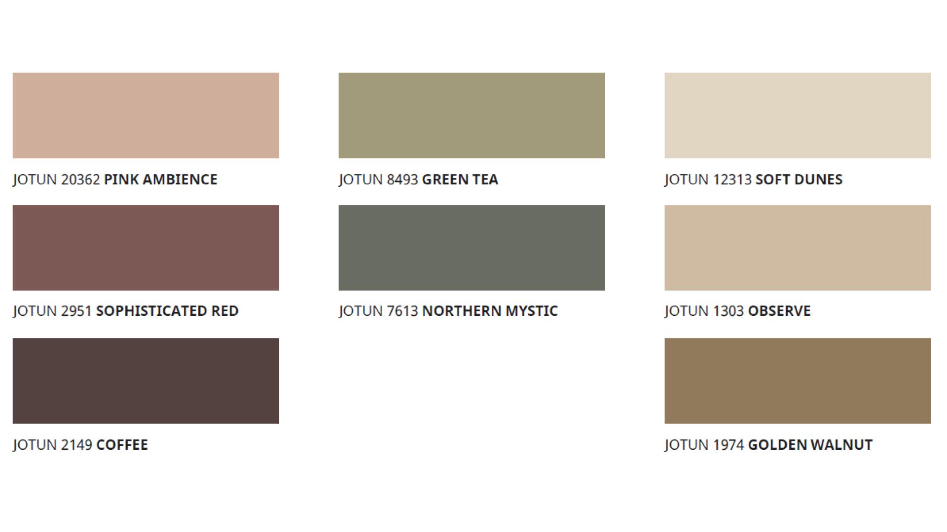 Jotun LADY 2951 Sophisticated Red 8493 Green Tea 12313 Soft Dunes